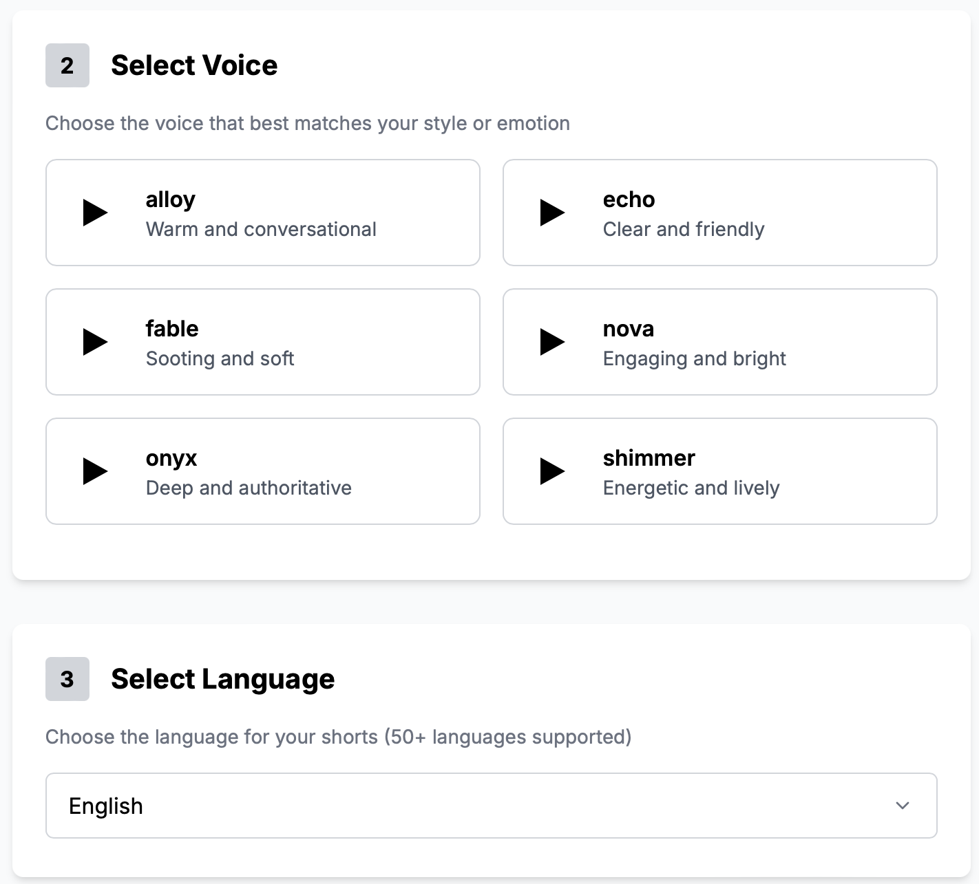 Select a voice, language and our AI will generate engaging video content based on your topic, language and voice style.